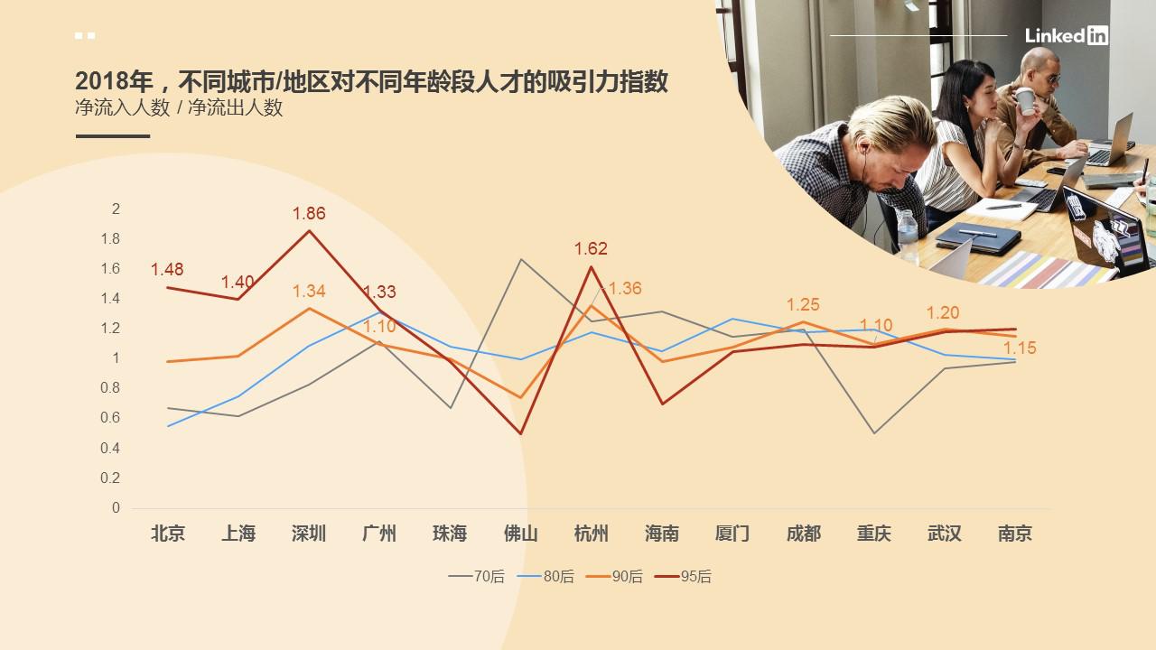 通過對(duì)比不同城市及地區(qū)的人才吸引力指數(shù)(凈流入人數(shù)/凈流出人數(shù)),領(lǐng)英數(shù)據(jù)顯示:對(duì)于新畢業(yè)的95后年輕人來說一線城市仍是畢業(yè)后職場(chǎng)起步的首選。
