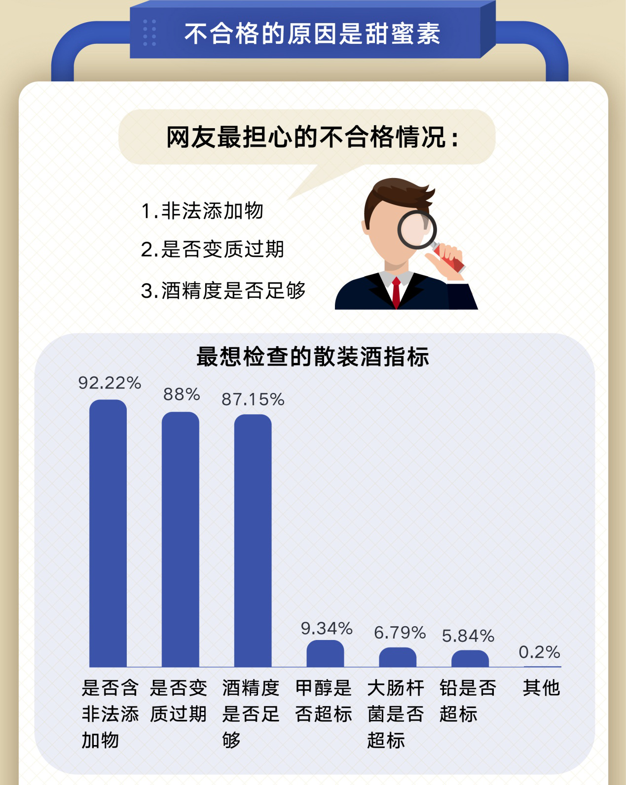 網友最想檢查的散裝酒指標有哪些?根據調查數據,網友最擔心的還是在散裝酒中的非法添加物;其次是酒水是否變質過期;排在第三位的是酒精度是否足夠。