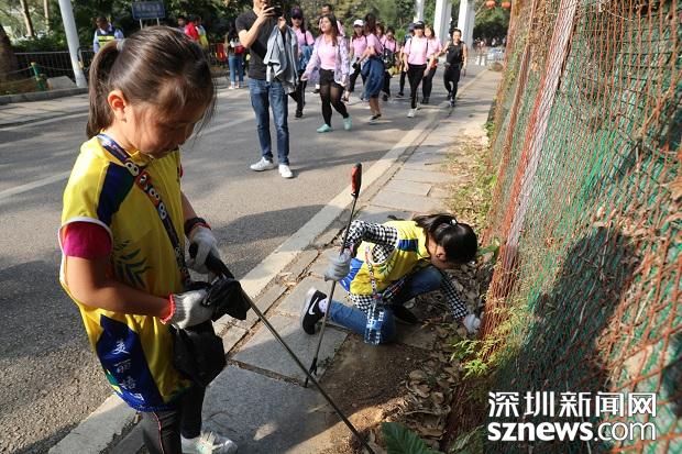 小朋友們也加入行動(dòng)(圖為一小朋友彎腰拾取縫中的垃圾)