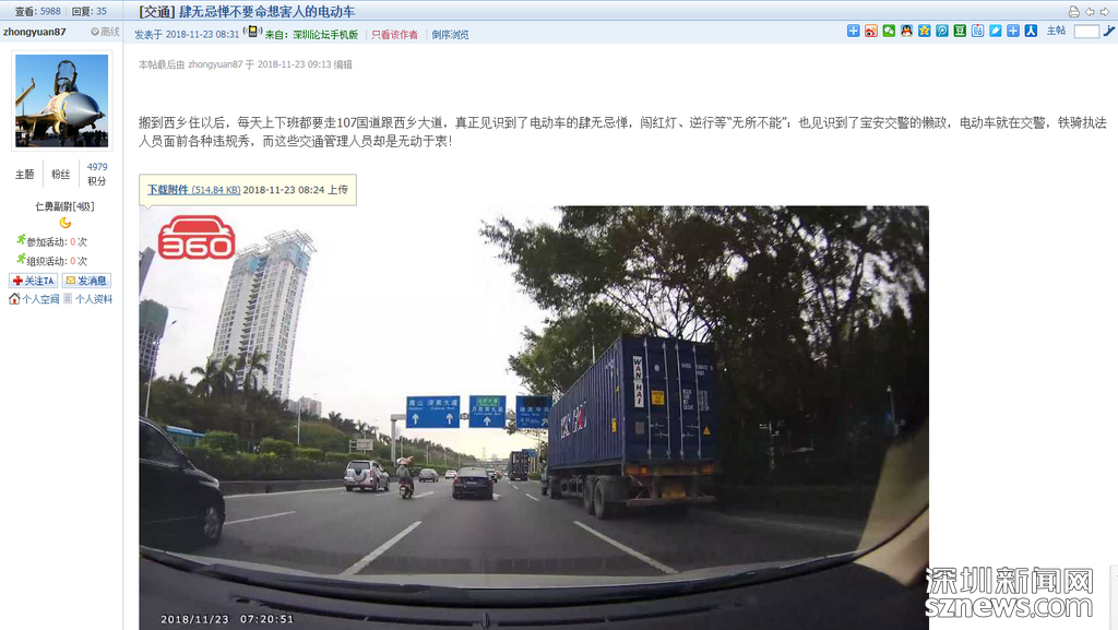 深圳新聞網(wǎng)11月28日訊(記者 劉婷)“電動(dòng)車闖紅燈、逆行、搶道等‘無所不能'?!苯?深圳論壇網(wǎng)友“zhongyuan87”發(fā)帖吐槽電動(dòng)車在107國(guó)道、西鄉(xiāng)大道無視交通規(guī)則肆意駕駛,擾亂正常秩序。(網(wǎng)帖:https://szbbs.sznews.com/thread-3824524-1-1.html)