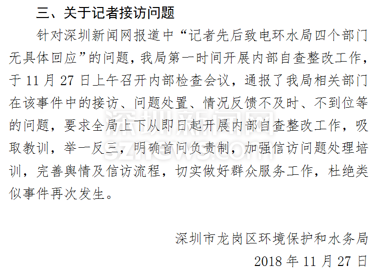 此外,對(duì)于前期報(bào)道中記者所提及的“先后致電四個(gè)部門均無(wú)具體回復(fù)”的情況,龍崗區(qū)環(huán)水局也給予了回應(yīng)。他們表示將在日后的工作中完善輿情和信訪流程,切實(shí)做好群眾服務(wù)工作。