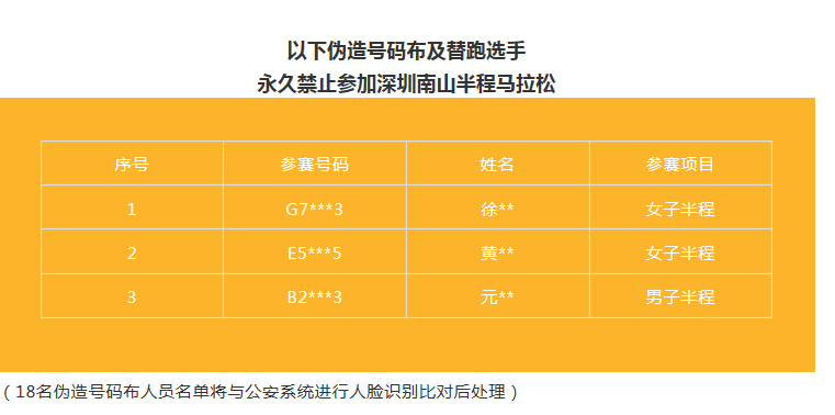 賽事組委會表示,賽后,他們也一直在整理、分析現(xiàn)場的照片、視頻等素材。期間組委會也已收到部分新舉報,包括抄近路、套牌及替跑等行為。經(jīng)查證,在2018深圳南山半程馬拉松比賽中,根據(jù)計時芯片數(shù)據(jù)、賽會錄像、現(xiàn)場照片等材料證明,總計違規(guī)選手人數(shù)258人,其中偽造號碼布18人,替跑3人,其他違規(guī)行為選手人數(shù)237人(其中穿越綠化帶人數(shù)46人)。經(jīng)組委會研究決定,按照《2018深圳南山半程馬拉松競賽規(guī)程》第7-8條規(guī)定,對258名違規(guī)選手作出如下處理,并根據(jù)要求將違規(guī)名單及處理結(jié)果上報至中國田徑協(xié)會: