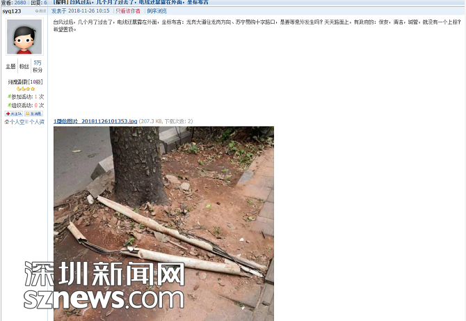 網(wǎng)友“syq123”發(fā)帖:臺風(fēng)過后,幾個月了過去了,電線還暴露在外面,坐標(biāo)布吉