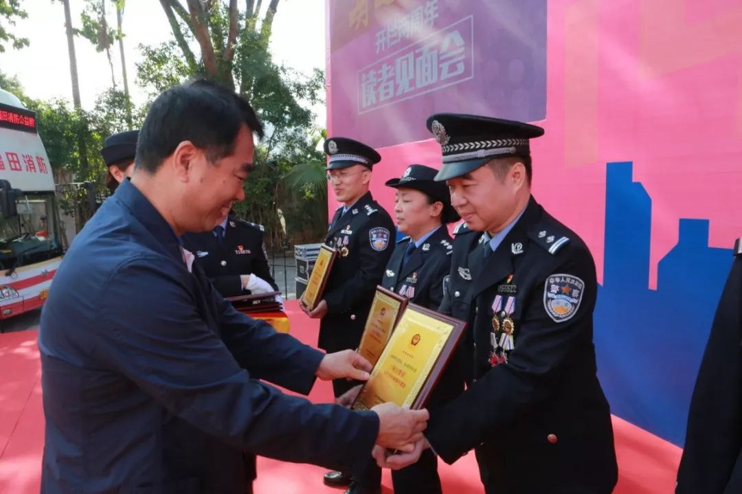 深圳市公安局與深圳特區(qū)報合辦的“每日警星”專欄讀者粉絲見面會在福田分局開放點火熱開展,來自深圳警隊刑偵、掃黑攻堅、治安、社區(qū)、特警、交警、預(yù)審等各個崗位的14名“每日警星”代表現(xiàn)場激情合唱中國人民警察警歌;徐文海與深圳報業(yè)集團黨組副書記、副社長、總編輯周斌共同為“每日警星”代表頒發(fā)紀念牌。