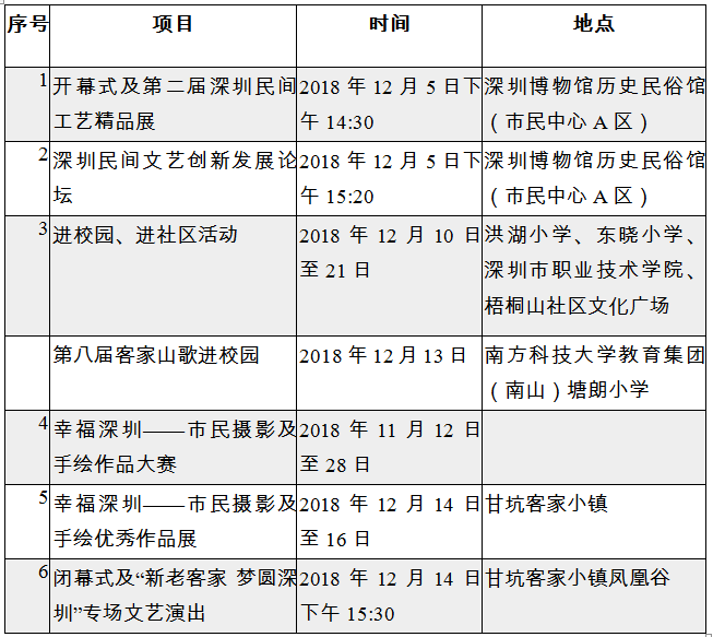 2018年12月10日至21日,將在洪湖小學(xué)、東曉小學(xué)、深圳市職業(yè)技術(shù)學(xué)院、梧桐山社區(qū)文化廣場舉辦4場進校園、進社區(qū)活動,組織民間藝術(shù)家表演客家山歌、陶笛、葫蘆絲、排簫、鋸琴、口哨、葉哨、粵曲,展示剪紙、剪影、臉譜繪制技藝,并現(xiàn)場與觀眾進行互動體驗。