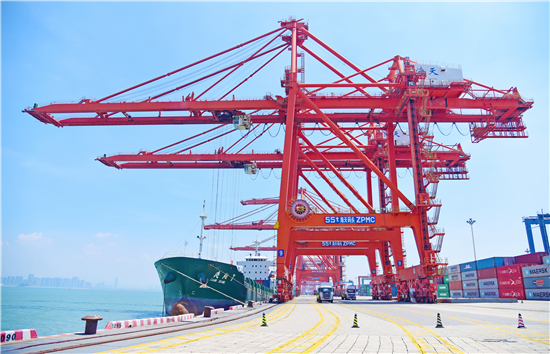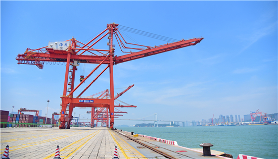 廈門網(wǎng)2018年6月28日訊 海面上響起船舶靠岸的鳴笛聲,一個(gè)個(gè)集裝箱在起重機(jī)的作用下,離開船舶正式上岸,在碼頭上整齊地排列著。在廈門港東渡港區(qū)海天碼頭,工作人員頂著烈日,有條不紊地進(jìn)行作業(yè),為城市發(fā)展注入源源不斷的活力。
