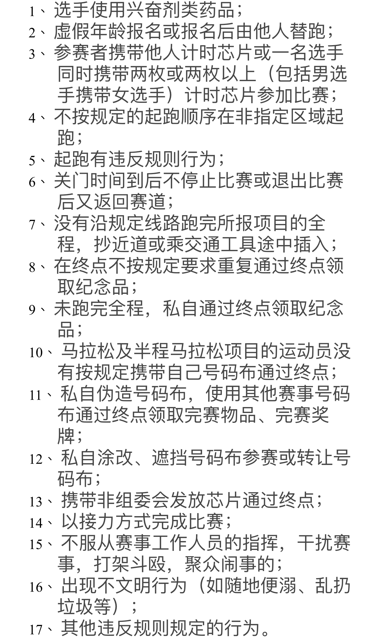 據(jù)悉,在比賽期間選手出現(xiàn)17項(xiàng)違規(guī)行為之一的問題,裁判員有權(quán)中止選手的比賽并當(dāng)場沒收違規(guī)選手的號碼布及芯片,取消其比賽資格,賽后由組委會(huì)視情節(jié)輕重分別給予參賽選手取消2018深馬比賽成績、禁賽1至2年,情節(jié)嚴(yán)重者終身禁賽等處罰,并將違規(guī)信息報(bào)送中國田協(xié)申請系列追加處罰。