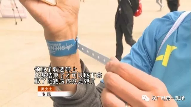 今天中午,已經(jīng)有不少要參與本次馬拉松比賽的市民,前往市民中心廣場(chǎng)領(lǐng)取號(hào)碼簿和參賽包。吳女士今年是第一次參加馬拉松全程的比賽。在領(lǐng)取的物品中,有一個(gè)藍(lán)色手環(huán)比較特別。
