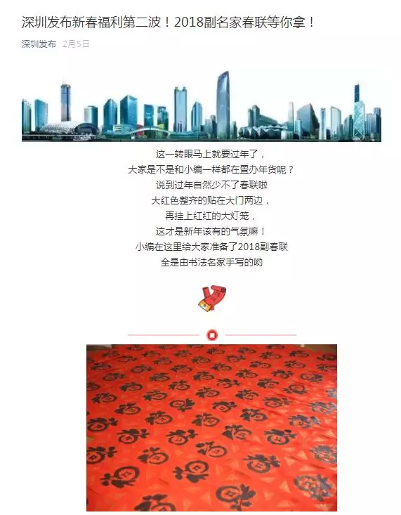 春節(jié)前后,許多人踏上回家路時。“深圳發(fā)布”的小編們在“送春聯(lián)”,春節(jié)當(dāng)天還在推送信息。