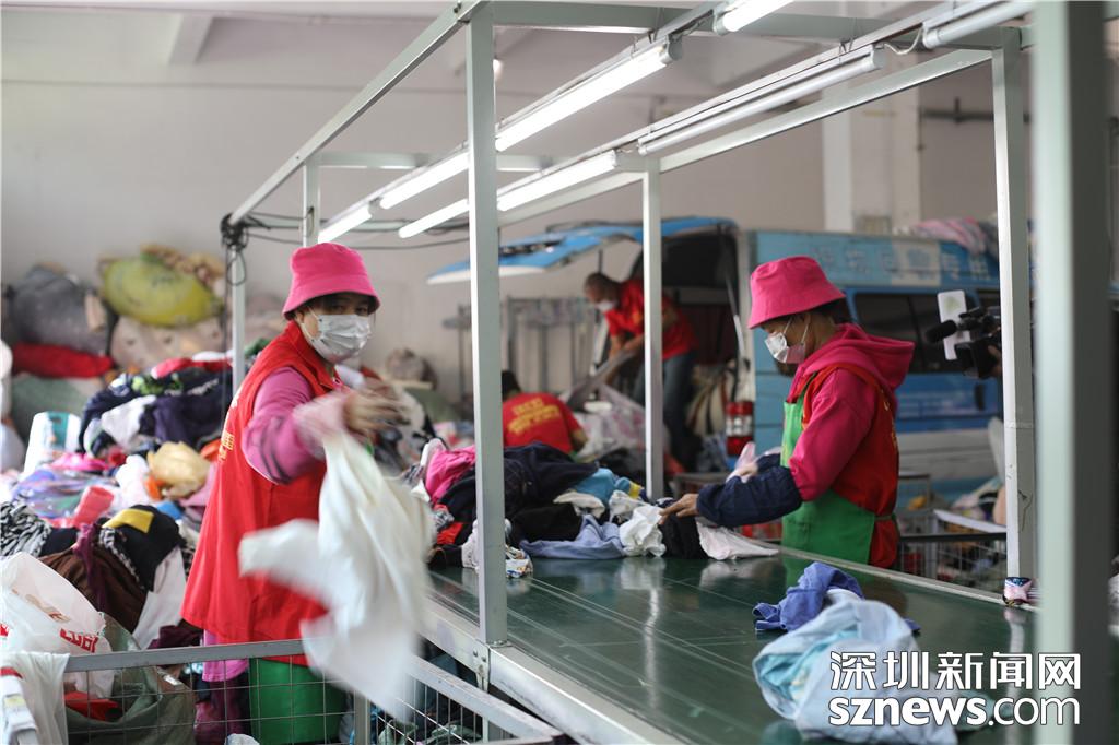 在分揀庫內(nèi),有兩個傳送帶,工作人員將分揀出來的衣服放置在分揀帶上,兩名工作人員在分揀帶中間,背后放有多個分揀筐,通過傳送帶前端傳遞過來的衣物,工作人員快速的將衣服分為校服、外套、短袖等類別進(jìn)行分揀工作,并放置在相應(yīng)的分揀筐中。