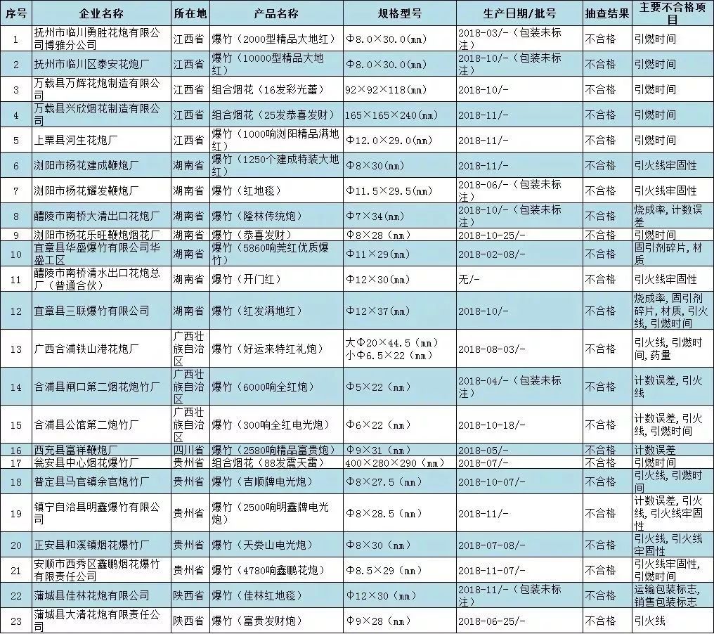 ③國家市場監(jiān)管總局日前組織開展煙花爆竹產(chǎn)品質(zhì)量國家監(jiān)督專項抽查,共抽查6個省(自治區(qū))150家企業(yè)生產(chǎn)的150批次產(chǎn)品,檢出23批次不合格,不合格發(fā)現(xiàn)率為15.3%。