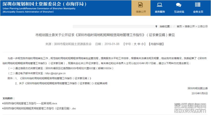 深圳新聞網(wǎng)2019年1月8日訊(記者 潘潤華)1月8日,市規(guī)土委起草發(fā)布《深圳市臨時(shí)用地和短期租賃用地管理工作指引(征求意見稿)》(以下簡(jiǎn)稱“征求意見”)。根據(jù)該征求意見,社會(huì)投資主體組織實(shí)施的急需公共服務(wù)設(shè)施用地為短期租賃用地,需按照我市地價(jià)測(cè)算相關(guān)規(guī)則繳交租金。