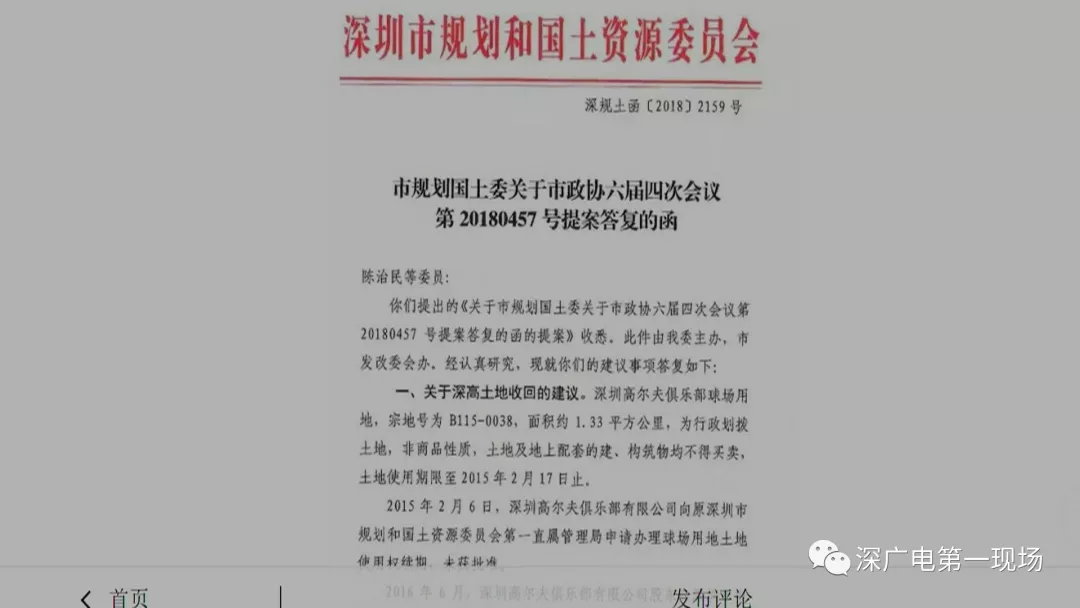 陳治民的提案,在去年獲得了深圳市規(guī)劃國(guó)土委的回復(fù),稱目前“深高”收地工作正有序開(kāi)展中,根據(jù)相關(guān)法律法規(guī),深圳高爾夫球場(chǎng)B115-0038宗地的土地使用權(quán),將被無(wú)償收回,地上建筑物、構(gòu)筑物等將給予適當(dāng)補(bǔ)償。