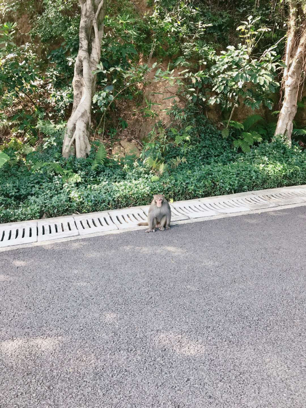 "這個東西很聰明,愛吃蘋果、香蕉和糖果,估計有三四十斤重,很肥。"今天上午,記者前往梅林山公園探訪猴子的蹤影。從梅山苑二期的梅林山公園入口一上公園主干道,記者就發(fā)現(xiàn)保安員陳先生正在路邊值守,梅林山公園管理處發(fā)現(xiàn)猴子后,就安排了保安員巡查看護。陳先生告訴記者,20日早上7點多猴子就出現(xiàn)在路邊,當(dāng)時公園人少,沒有討到吃的就走了。上午10點多,乘著游玩的人多猴子又跑出來湊熱鬧,保安員發(fā)現(xiàn)后拿了香蕉、橘子和糖果給它,猴子也一點不客氣,從人手里接過來就吃。原本靜謐的公園隨著猴子的出現(xiàn)熱鬧起來,圍觀的市民也紛紛慷慨解囊。這只胖乎乎的猴子一點也不怕人,最近時距離人不到一米遠(yuǎn),大家也親切叫它"肥仔"。