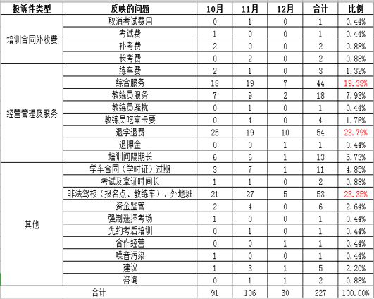 第四季度投訴主要集中在退學退費、非法駕校(報名點、教練車)、外地班等問題。學員與不合規(guī)范的駕校、外地班產(chǎn)生的矛盾是本季度產(chǎn)生投訴的主要原因;此外,還有部分學員反映綜合服務等問題。