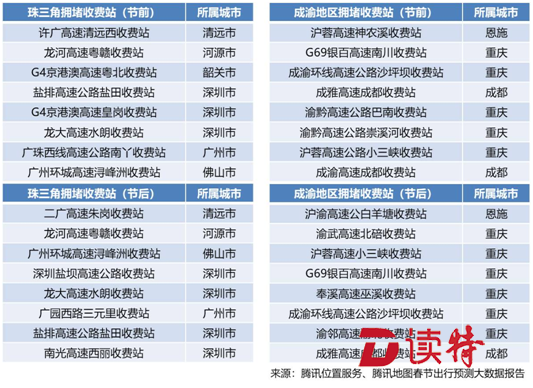 在珠三角地區(qū),擁堵收費站全部位于廣東省內,集中分布在廣州、深圳等中心城市周邊,及通往湖南、江西的省界區(qū)域,擁堵時間與長三角相同。長深高速東江大橋至泰美服務區(qū)、莞佛高速坦尾立交至虎門大橋,預計將成為節(jié)前、節(jié)后最擁堵的高速路段。