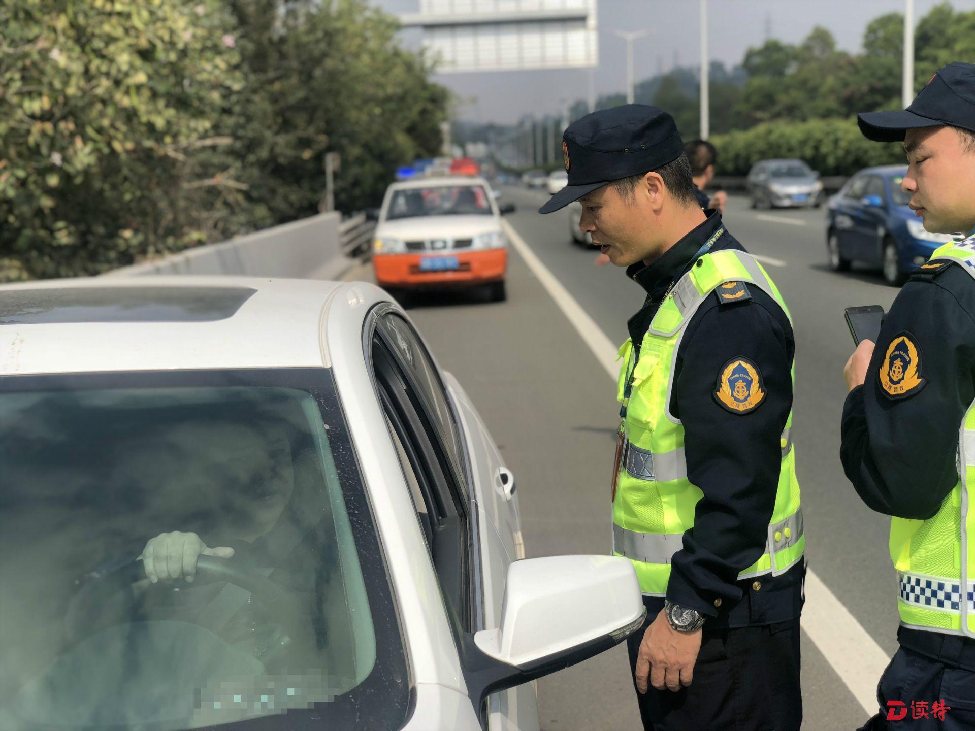 11:20,南光高速光明路段路邊應(yīng)急車道上,有一輛小車停靠。馬明海和開車的老林一起下車,走過去詢問。原來這輛小車爆胎了,正在等待維修廠送備胎過來。馬明海讓車內(nèi)司機(jī)和乘客趕緊下車,盡量往路邊站?!耙郧案咚俟飞铣鲞^這樣的事故,小車拋錨后,車主沒有下車,結(jié)果后面的車輛沒注意撞上來,車內(nèi)的人都沒了?!崩狭盅a(bǔ)充道:“下車后也不能站在車前或車后,這些位置都很危險(xiǎn),最好站到高速護(hù)欄的外面去等待救援?!笨吹綊佸^車輛后面只放了一個(gè)很小的三角架,馬明海回到巡檢車上,拿下來兩個(gè)反光錐放到小車后:“一定要讓其他車輛能很遠(yuǎn)就看到這里有車輛停靠,千萬不能發(fā)生二次事故?!?/p>