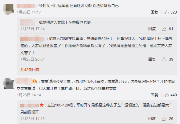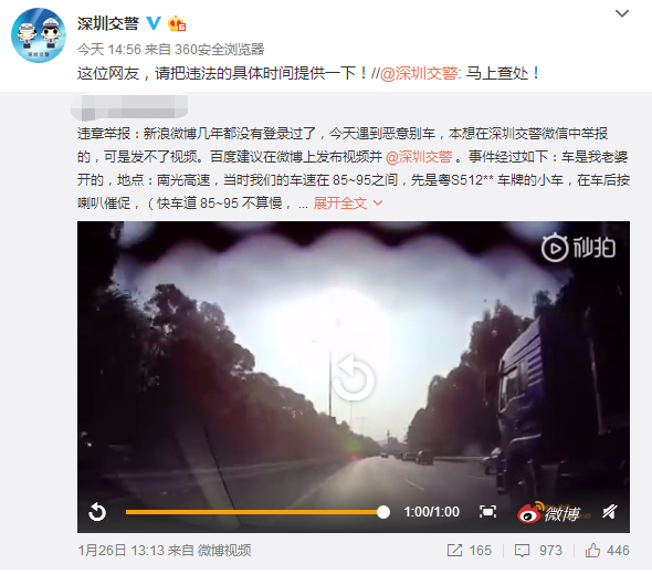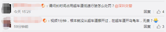 1月28日下午5點,深圳交警在微博上也給網(wǎng)友作出回復(fù),對于長時間龜速占用超車道的行為也將一并調(diào)查。