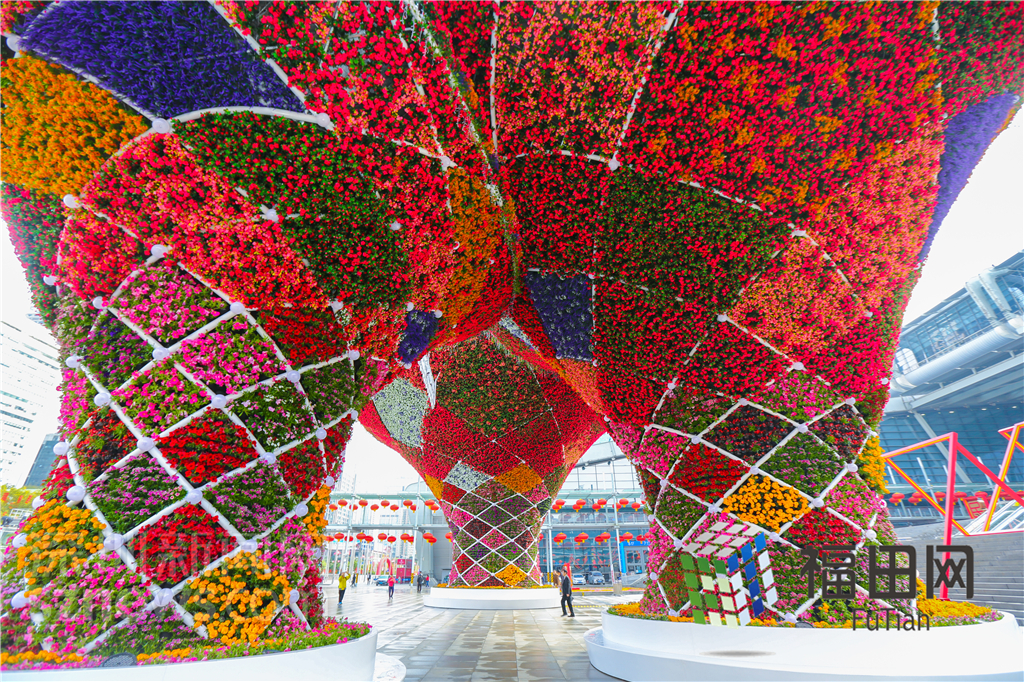 在會(huì)展中心門口,首先映入眼簾的便是一座高15米,寬40米的迎春花市門樓。記者了解到,該門樓本身就是一件花卉藝術(shù)作品,主題為——花開鵬城。以盛開抽象的花形為設(shè)計(jì)元素,采用流暢的交織曲線并結(jié)合七彩花卉,打造一種花開鵬城的韻味,突出迎春花市的氣息。