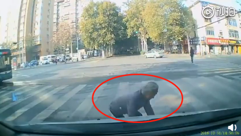 老太太走到小車正前方時(shí)卻突然停下腳步,緊接著緩緩臥倒在地。