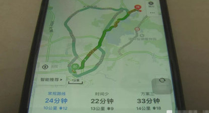 導(dǎo)航路線顯示,乘客所堅(jiān)持的走法是常規(guī)路線,司機(jī)的走法距離更長(zhǎng),但用時(shí)較短。