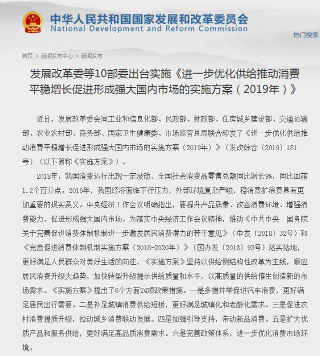1月29日,“看不過去”的發(fā)改委就印發(fā)了《進(jìn)一步優(yōu)化供給推動(dòng)消費(fèi)平穩(wěn)增長促進(jìn)形成強(qiáng)大國內(nèi)市場的實(shí)施方案(2019年)》