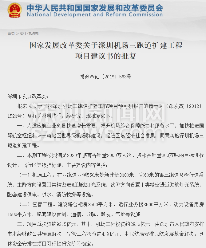 國家發(fā)展改革委關(guān)于深圳機場三跑道擴建工程項目建議書的批復(fù)截圖