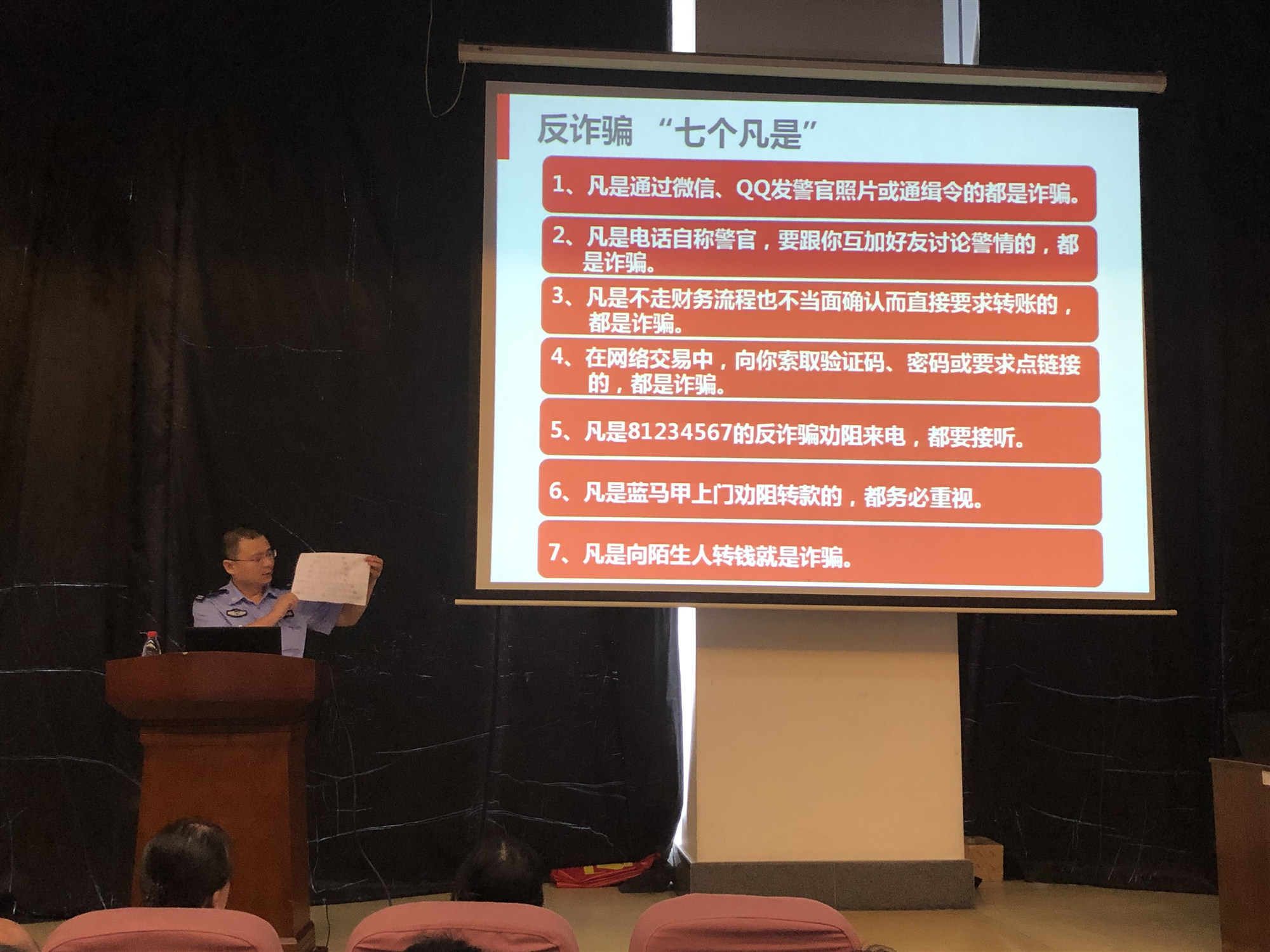 4月12日下午,惠杰副所長、社區(qū)民警黃旭波、孫立波在財(cái)富廣場小禮堂開展香蜜湖“反詐騙課堂”第一場,向財(cái)富廣場各公司負(fù)責(zé)人、財(cái)務(wù)人員開展反詐騙宣傳,“反詐騙宣傳”PPT包含反詐騙工作面臨的嚴(yán)峻形式、電信詐騙的常見手段、各類案例及宣傳視頻、電信詐騙的防范要點(diǎn)、以及社區(qū)民警的微信二維碼名片等等。此次宣傳借用大廈的會(huì)議室、物業(yè)單位的小禮堂,將本樓的商戶、公司集中在一起,形成區(qū)域效應(yīng);突出重點(diǎn)人員,主要針對(duì)單位負(fù)責(zé)人、財(cái)務(wù)人員,切實(shí)提高居民自我防范意識(shí)。