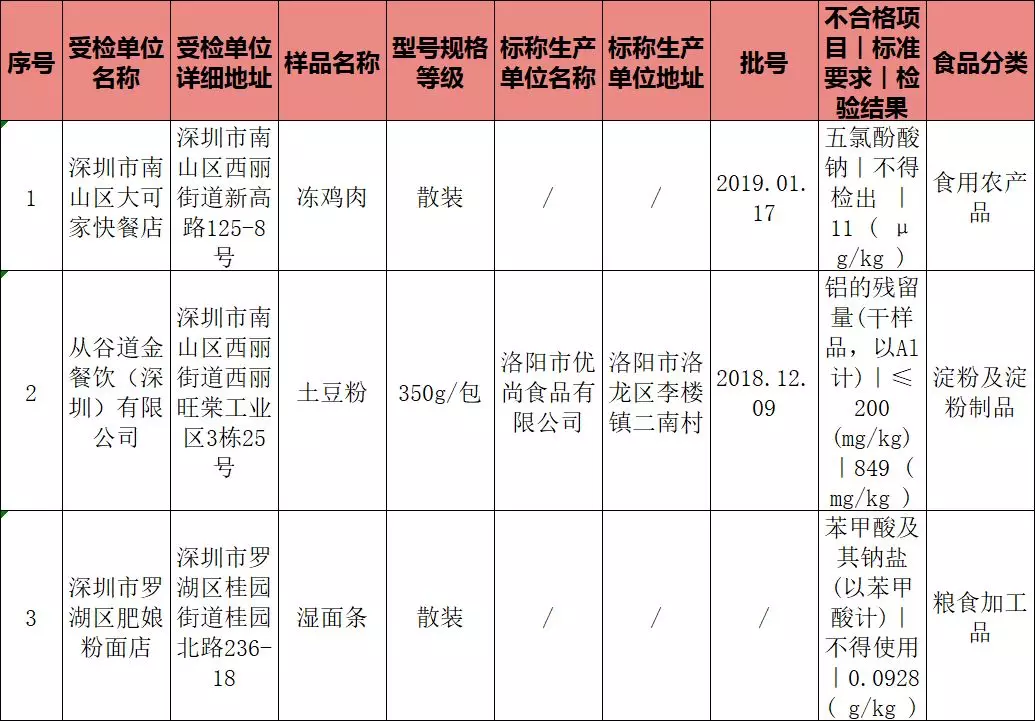 淀粉制品不合格樣品為土豆粉,不合格受檢單位是南山區(qū)西麗街道的從谷道金餐飲(深圳)有限公司,不合格項目為鋁的殘留量超標。