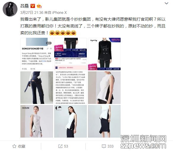 無獨有偶。5月5日,深圳影兒時尚集團(以下簡稱:影兒集團)正式向深圳市中級人民法院提起訴訟請求,就超模呂燕多次在微博上指責影兒集團是“抄抄集團”,造成影兒集團重大名譽損失和巨額經(jīng)濟損失一事,起訴超模呂燕及其公司上海是你商貿有限公司不正當競爭,要求兩被告立即停止侵權行為,賠償經(jīng)濟損失1000萬元,并公開道歉。