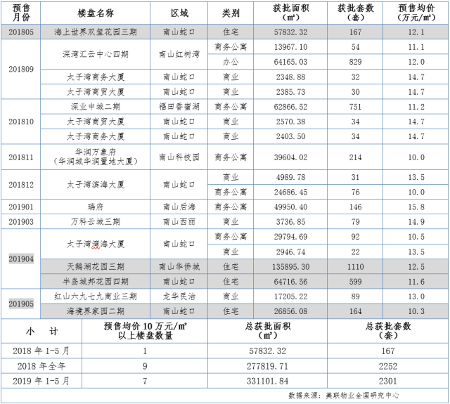 深圳預(yù)售均價10萬元/㎡以上的樓盤(2018.1-2019.5)