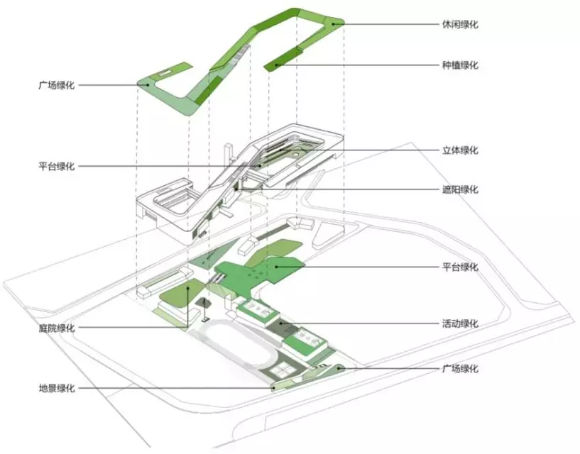 龍華區(qū)行知學(xué)校用地被西側(cè)的城市綠地、東南角的獅徑公園所包裹,具備天然的景觀優(yōu)勢(shì)。在內(nèi)部布局中,將場地、屋頂、架空層、立面結(jié)合起來,賦予多層次的綠化空間,打造真正的綠色校園。