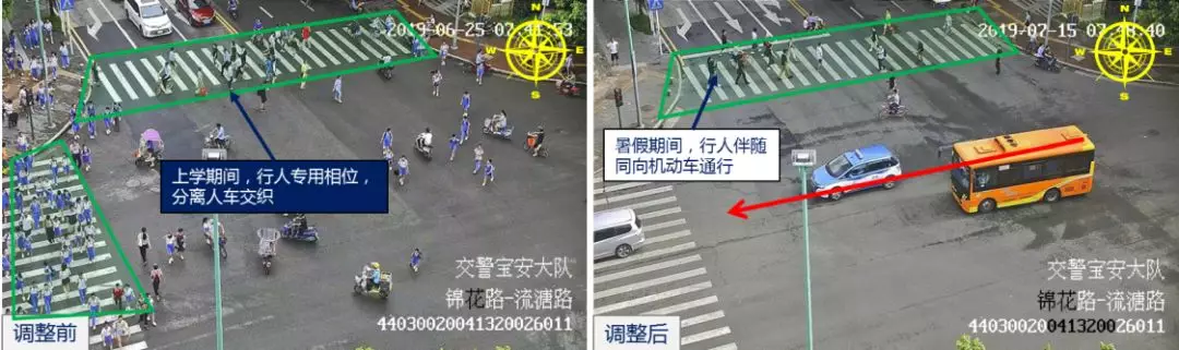 開學(xué)期間,校園周邊行人眾多,為保障學(xué)生安全過(guò)街,行人專用相位必須得安排上。當(dāng)暑假來(lái)臨,學(xué)校周邊行人通性需求降低,除部分行人過(guò)街需求大的路口,其它行人專用相位都被取消啦!