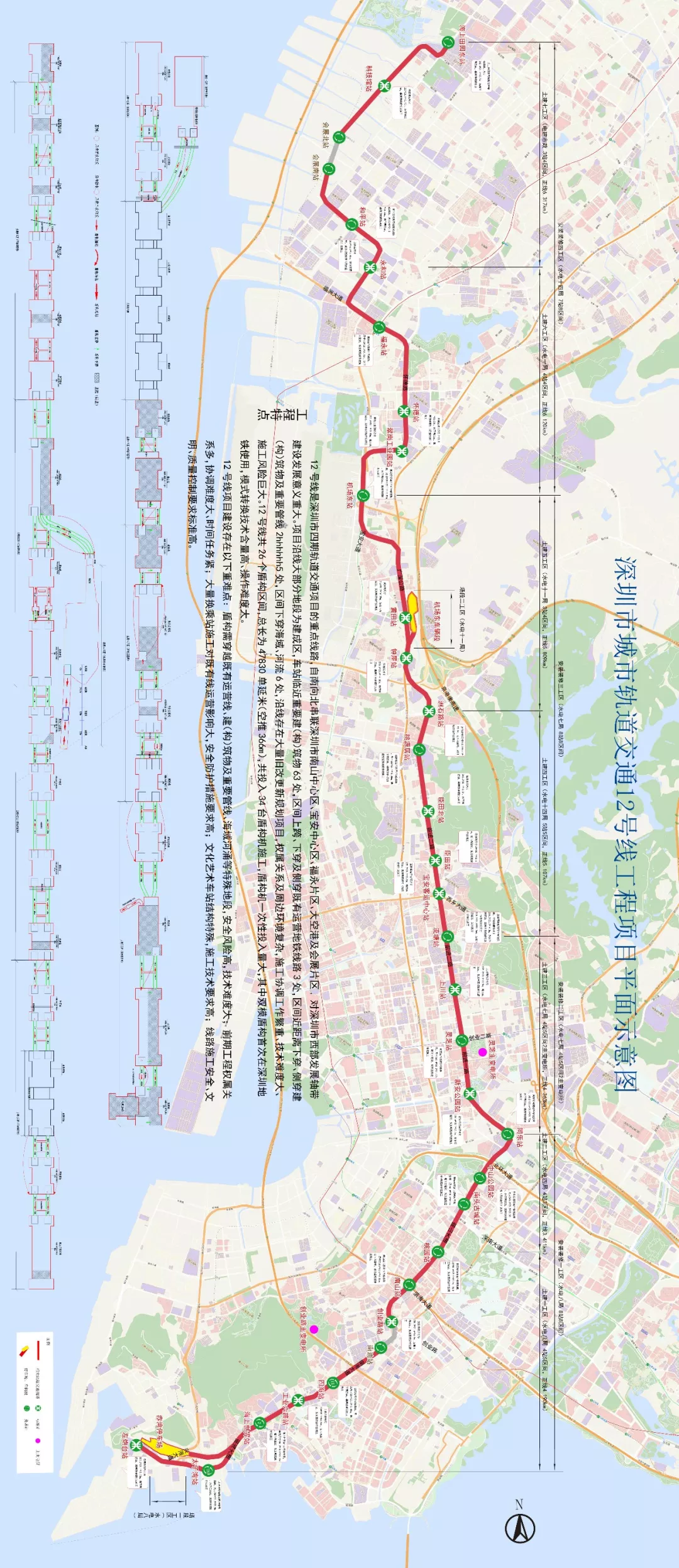 地鐵12號(hào)線起自南山區(qū)左炮臺(tái)站自南向北穿越南山中心區(qū)、寶安中心區(qū)、福永、大空港等片區(qū)后終至寶安區(qū)海上田園東站,線路全長40.56km,是進(jìn)一步支撐深圳西部發(fā)展,提升前海蛇口自貿(mào)區(qū),空港新城發(fā)展品質(zhì)的交通骨干線。