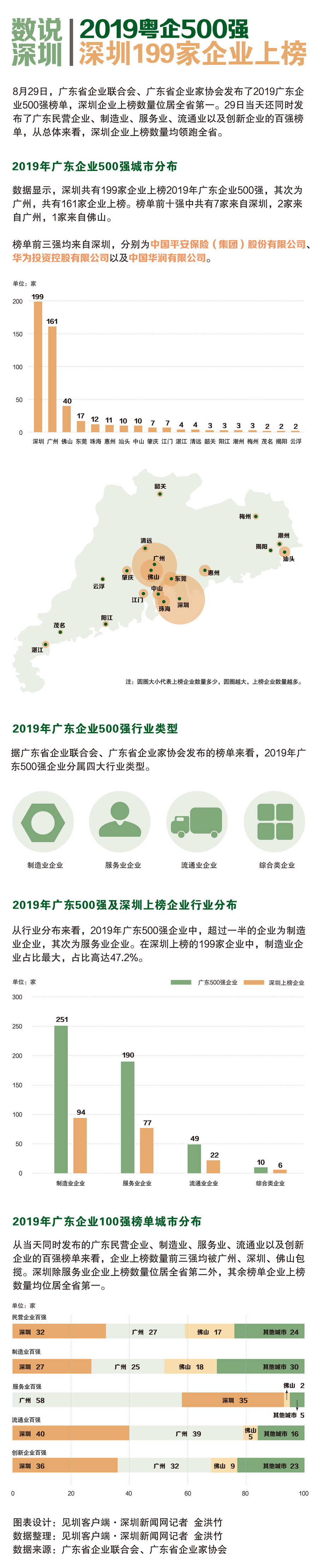 數(shù)據(jù)顯示,深圳共有199家企業(yè)上榜2019廣東企業(yè)500強(qiáng),其次為廣州,共有161家企業(yè)上榜。榜單前十強(qiáng)中共有7家來(lái)自深圳,2家來(lái)自廣州,1家來(lái)自佛山。