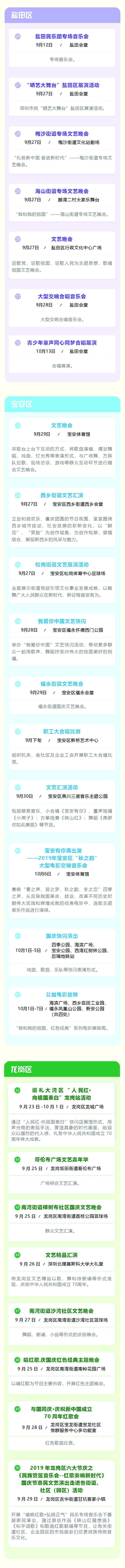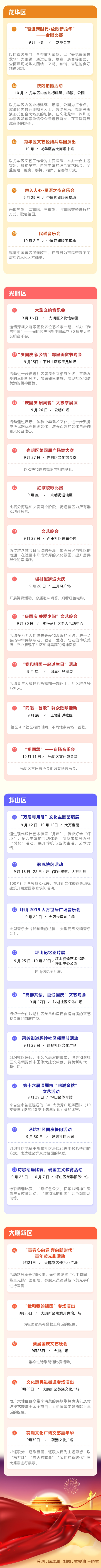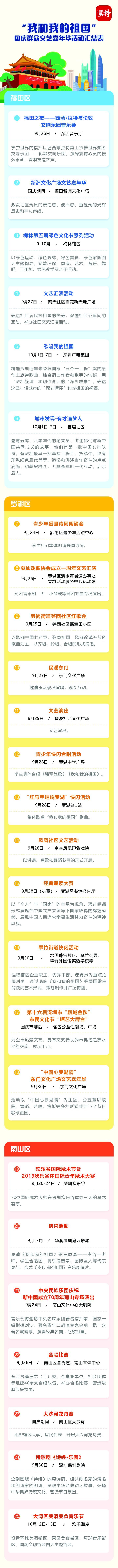為慶祝中華人民共和國(guó)成立70周年,深圳市將舉辦專場(chǎng)音樂(lè)會(huì)、群眾文藝晚會(huì)、焰火晚會(huì)等活動(dòng),同時(shí)將舉行10場(chǎng)“愛我中華——南粵百園慶國(guó)慶”主題游園及80場(chǎng)“我和我的祖國(guó)”國(guó)慶群眾文藝嘉年華活動(dòng)。主題游園和文藝嘉年華活動(dòng)安排如下: