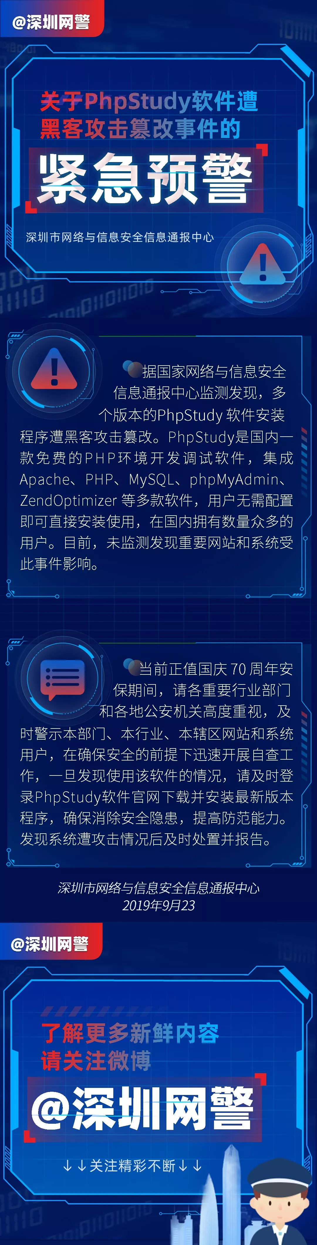 當前正值國慶70周年安保期間,請各重要行業(yè)部門和各地公安機關高度重視,及時警示本部門、本行業(yè)、本轄區(qū)網站和系統(tǒng)用戶,在確保安全的前提下迅速開展自查工作。