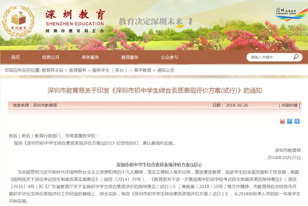 據(jù)了解,《綜評方案》主要包含思想品德、學業(yè)水平、身心健康、藝術素養(yǎng)和實踐創(chuàng)新等5個方面,以寫實記錄、學生成長過程性資料記錄、評語評價及重要觀測點計分評價相結合的形式評價深圳市初中學生綜合素質表現(xiàn),并從2018年秋季入學的初一新生開始實施。
