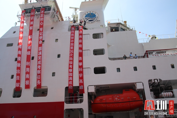 雪龍2號上的船員和科考隊員向岸上的送別人群揮手告別,“感謝祖國、感謝深圳!”
