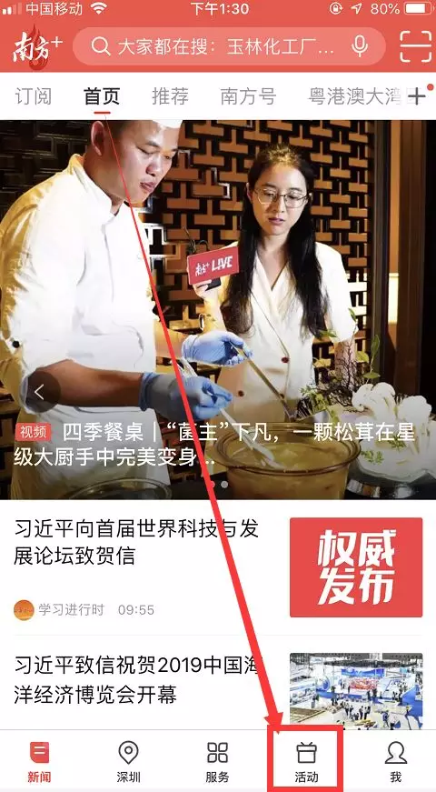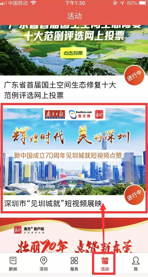 2、打開(kāi)南方+客戶(hù)端首頁(yè),在首頁(yè)底部菜單欄點(diǎn)擊“活動(dòng)”