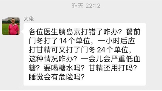 原來,是已經(jīng)出院的糖尿病患者李大叔,因看電視分散注意力,未仔細進行核對,誤將門冬胰島素當成甘精胰島素注射了24U,注射完后發(fā)現(xiàn)注射錯誤,立即在微信群進行求助。