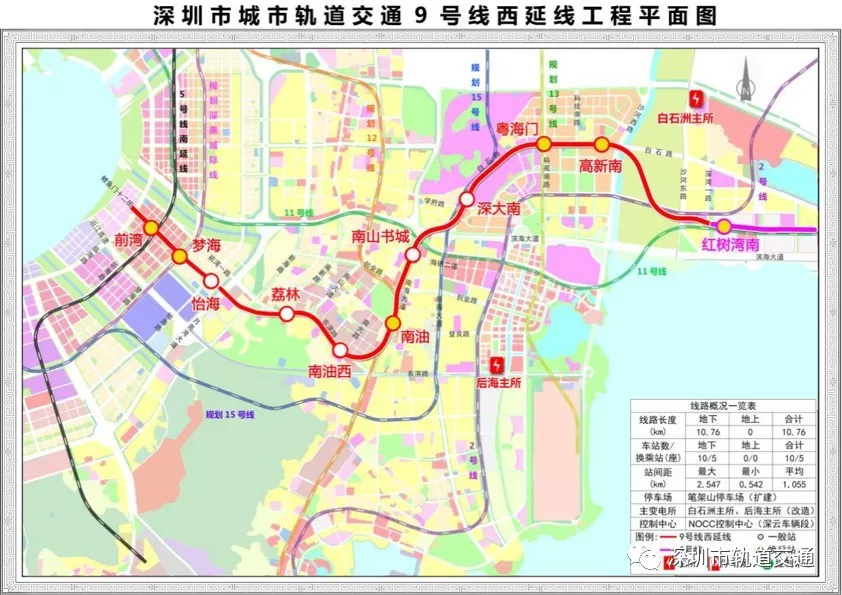 地鐵9號線西延線深入南山中心區(qū)和前海自貿區(qū),西起前灣站(與5號線南延線換乘),東至紅樹灣南站,全長約10.8公里,共設10座車站,其中5座換乘站。