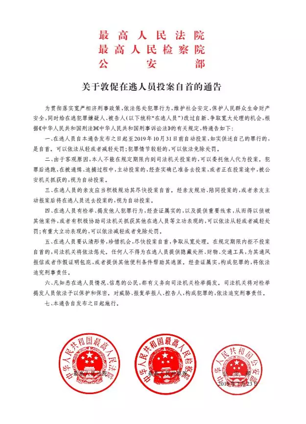 7月24日,公安部新聞發(fā)布會公布了最高人民法院、最高人民檢察院、公安部聯(lián)合印發(fā)的《關(guān)于敦促在逃人員投案自首的通告》。