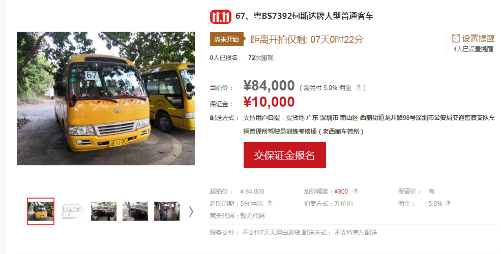 競買人應(yīng)于拍賣會前在京東拍賣平臺進(jìn)行實(shí)名登記注冊,注冊成功后請按京東拍賣平臺的提示進(jìn)行操作;競買人在對拍賣標(biāo)的物首次確認(rèn)出價(jià)競拍前,按系統(tǒng)提示報(bào)名繳納10000元/輛的保證金;在競價(jià)過程中,請競買人按規(guī)定的加價(jià)幅度300元出價(jià),若自行出價(jià),請仔細(xì)核對好出價(jià)金額,若出現(xiàn)出價(jià)金額錯(cuò)誤的情況,由買受人自行承擔(dān)后果;拍賣成交后,買受人請于拍賣成交之時(shí)起72小時(shí)內(nèi)全額支付拍賣成交價(jià)款、拍賣傭金、增值稅及附加、機(jī)動(dòng)車轉(zhuǎn)移登記車牌費(fèi),并到廣東華士德(深圳)拍賣行有限公司所在地(深圳市羅湖區(qū)中興路219號華興酒店4樓)簽署《拍賣成交確認(rèn)書》及辦理相關(guān)手續(xù)。