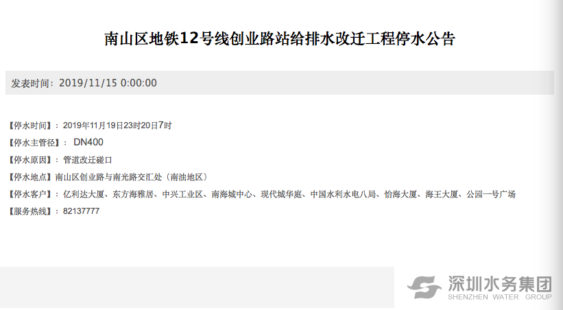 為配合南山區(qū)地鐵12號(hào)線創(chuàng)業(yè)路站給排水改遷工程,深圳水務(wù)集團(tuán)計(jì)劃于11月19日23時(shí)20日7時(shí),對(duì)南山區(qū)創(chuàng)業(yè)路與南光路交匯處DN400供水管道進(jìn)行改遷碰口,屆時(shí)南油地區(qū)暫停供水。具體影響用戶為:億利達(dá)大廈、東方海雅居、中興工業(yè)區(qū)、南海城中心、現(xiàn)代城華庭、中國水利水電八局、怡海大廈、海王大廈、公園一號(hào)廣場(chǎng)。