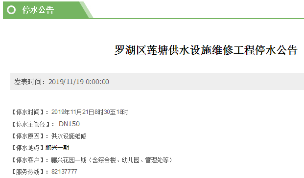 見圳客戶端·深圳新聞網(wǎng)2019年11月21日訊 據(jù)深圳市水務(wù)局消息,11月21日,福田、南山、羅湖區(qū)均有小區(qū)計劃停水,其中羅湖區(qū)鵬興花園一期從早上8時30分至下午18時停水,其它地方均在晚間。計劃停水安排如下: