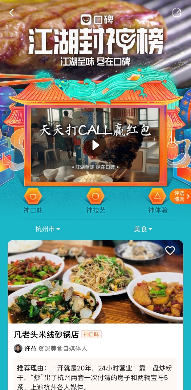 今年“雙12”,口碑餓了么首次發(fā)布“江湖封神榜”,入圍店鋪先由美食體驗(yàn)者、觀察家、媒體團(tuán)在內(nèi)的本地評審團(tuán)先提名,再經(jīng)過阿里本地生活大數(shù)據(jù)進(jìn)行智能評分,同時邀請眾多消費(fèi)者投票驗(yàn)名“真身“。商戶上榜不靠流量,不用刷單,也不必?fù)?dān)心惡意差評影響流量和排名。消費(fèi)者就算沒有本地老餮帶路,參考“江湖封神榜”就能找到地道美食。目前,首批入選的1730家店鋪,分布在北京、杭州、成都、廣州等13座城市。消費(fèi)者通過口碑a(chǎn)pp上選擇相應(yīng)的城市坐標(biāo),點(diǎn)擊“江湖封神榜”,就可以找到推薦好店。