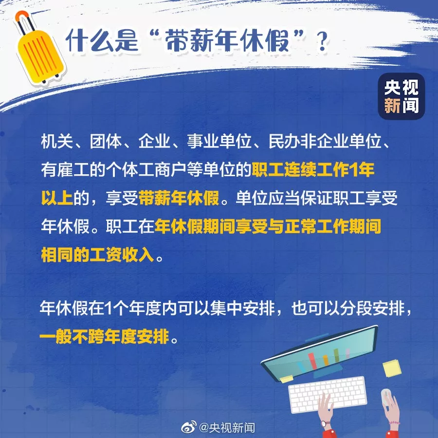 據(jù)《職工帶薪年休假條例》:職工累計(jì)工作時(shí)間已滿1年不滿10年,年休假5天;已滿10年不滿20年,年休假10天;已滿20年,年休假15天。