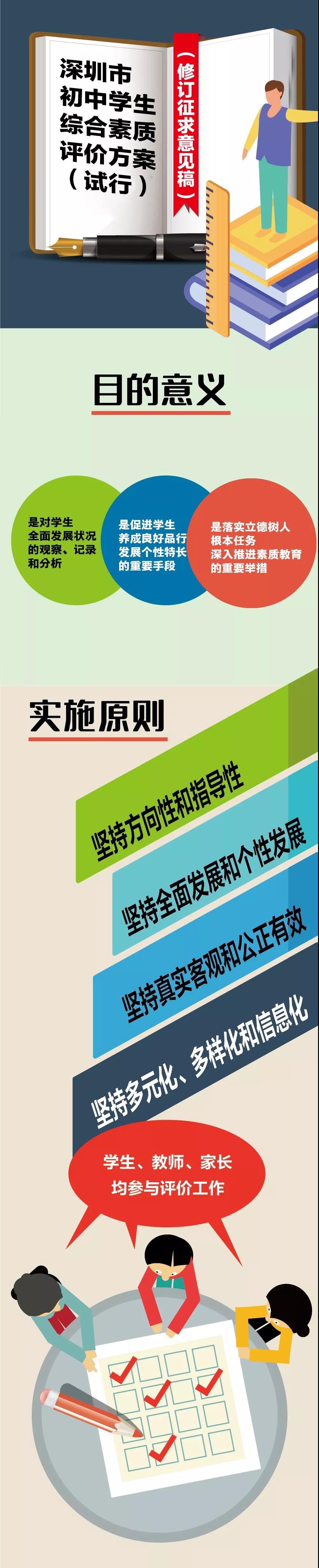 為深入貫徹中共中央、國務院《關(guān)于深化教育教學改革全面提高義務教育質(zhì)量的意見》和《教育部關(guān)于進一步推進高中階段學??荚囌猩贫雀母锏闹笇б庖姟罚ń袒?016〕4號)、《廣東省教育廳關(guān)于實施初中學生綜合素質(zhì)評價的指導意見(試行)》(粵教基[2018]10號)等文件精神,落實立德樹人根本任務,“五育并舉”,促進學生的全面發(fā)展和個性發(fā)展,根據(jù)工作需要,深圳市教育局于2019年12月11日啟動了《深圳市初中學生綜合素質(zhì)評價方案(試行)》的修訂工作。在大量調(diào)研論證、多方征求意見的基礎上,形成了《深圳市初中學生綜合素質(zhì)評價方案(試行)(修訂征求意見稿)》。