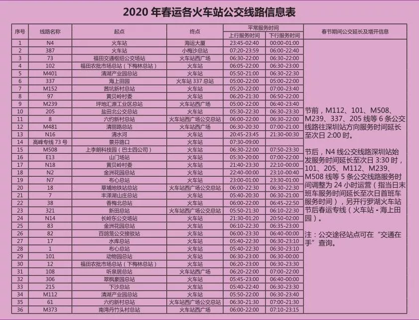 見圳客戶端·深圳新聞網(wǎng)2020年1月20日訊 又將迎來離深高峰,為方便大伙趕高鐵火車,深圳的公交地鐵都開啟最強(qiáng)加班模式,延長服務(wù)時間。很多小伙伴就很關(guān)心,途經(jīng)各大火車站的公交線有哪些?運營的時間是幾點?